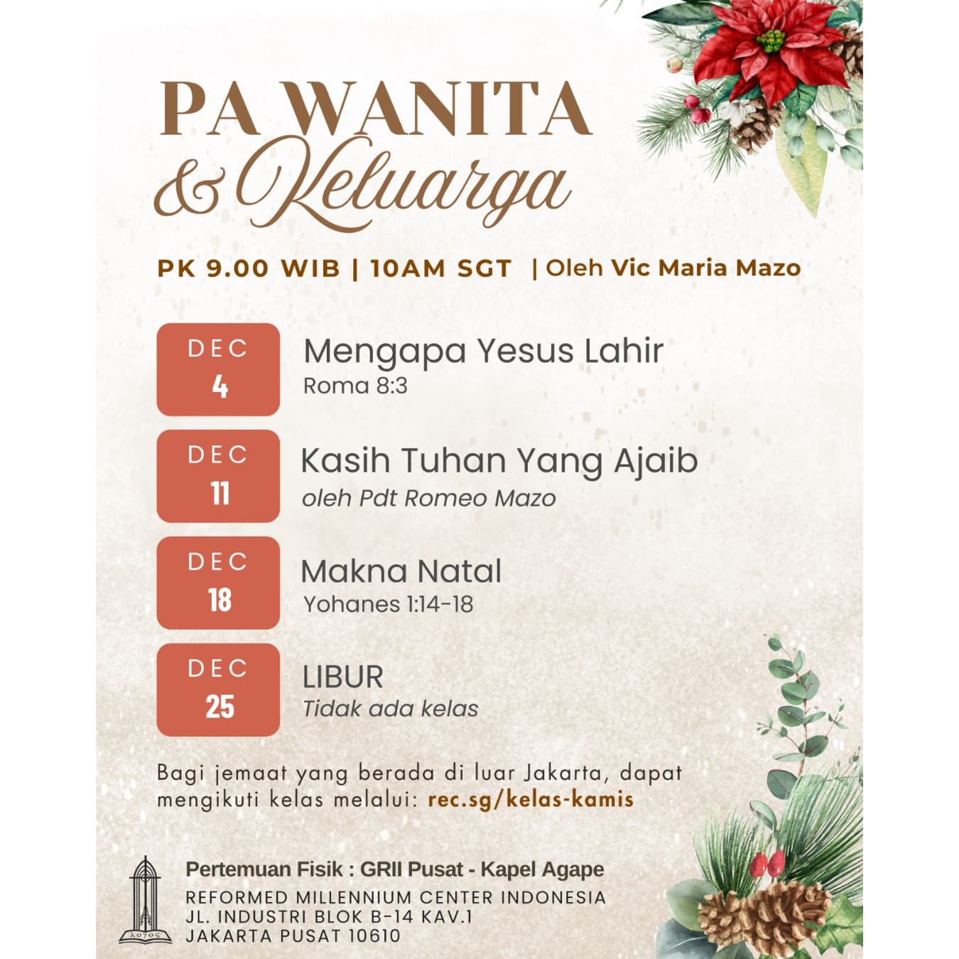 Kelas pemahaman Alkitab setiap hari Kamis pagi.