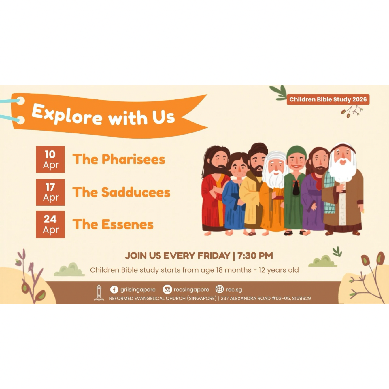 Kelas-kelas Sekolah Minggu diadakan bagi anak-anak berusia 2-12 tahun bersamaan dengan Ibadah Minggu Sore.