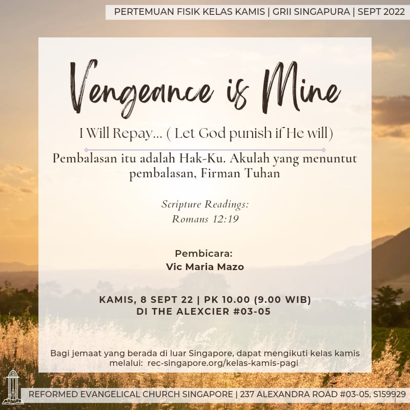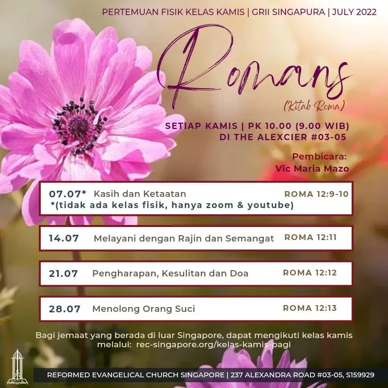 Kami mengundang jemaat sekalian untuk hadir dalam PA UMUM RECS secara fisik. TEMA: ‘Get in, Get in’: The 500th Anniversary of Luther’s BiblePembicara: Prof. Herman J. SelderhuisTempat: The Alexcier #03-05, 237 Alexandra Road, S159929Waktu: Pk. 7.30pm